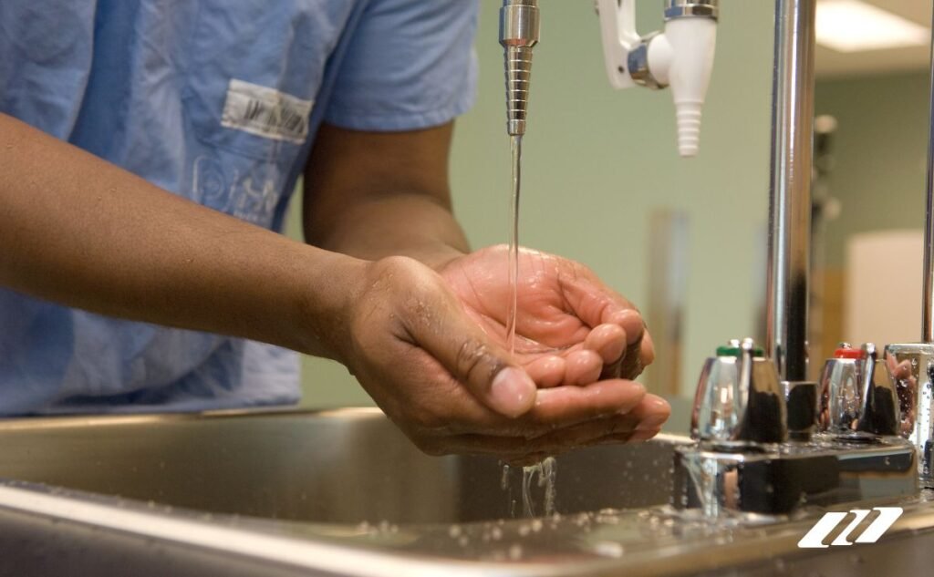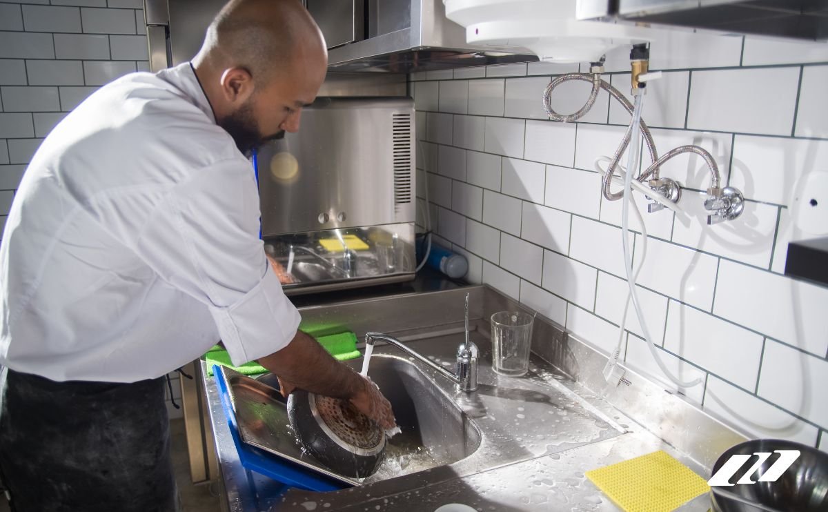 La limpieza en la cocina empieza con las manos. Un lavamanos visible y moderno transmite confianza y compromiso con la inocuidad alimentaria. - Clínicas, Laboratorios y Centros de Salud